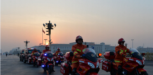 據(jù)報(bào)道 北京天安門配置新型消防摩托消防裝備。